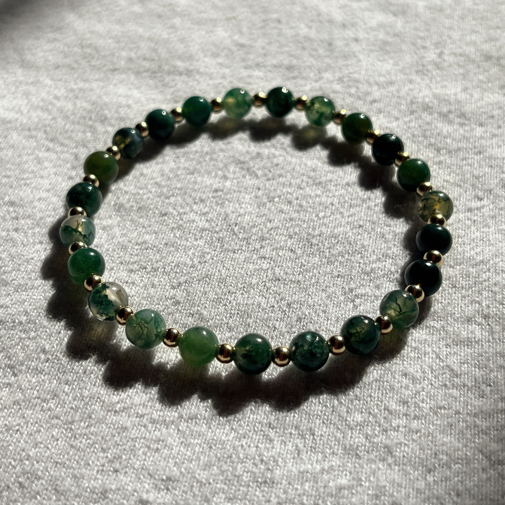 Feed your very soul in style with this green and gold water-resistant, hypoallergenic and tarnish-free bracelet. We specifically used natural crystal beads of moss agate to bring you new beginnings, personnal growth, abundance, prosperity, and balance.