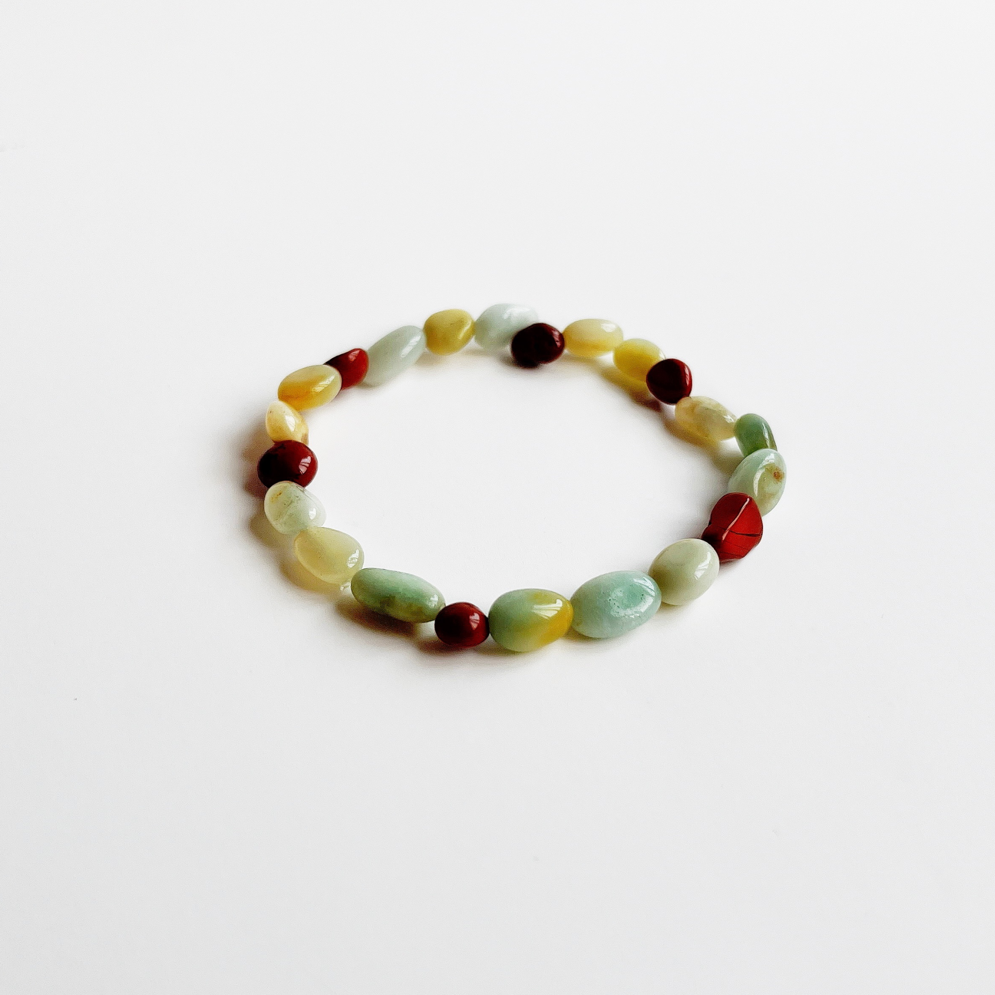 This bracelet carries the same soul-soothing energy as the Gaia Necklace. Made with natural red jasper for grounding, amazonite for calm, and freshwater pearls for natural grace.